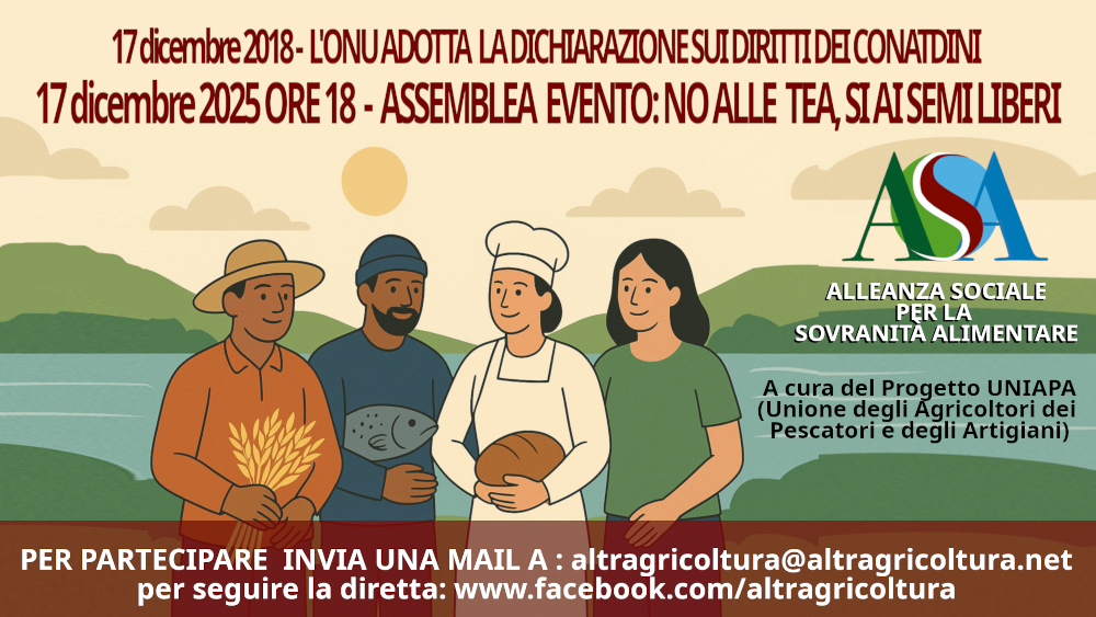 L’Alleanza Sociale per la Sovranità Alimentare per la Sovranità Alimentare riprende il suo cammino e, nel giorno dell’anniversario della UNNDROP invita all’evento online