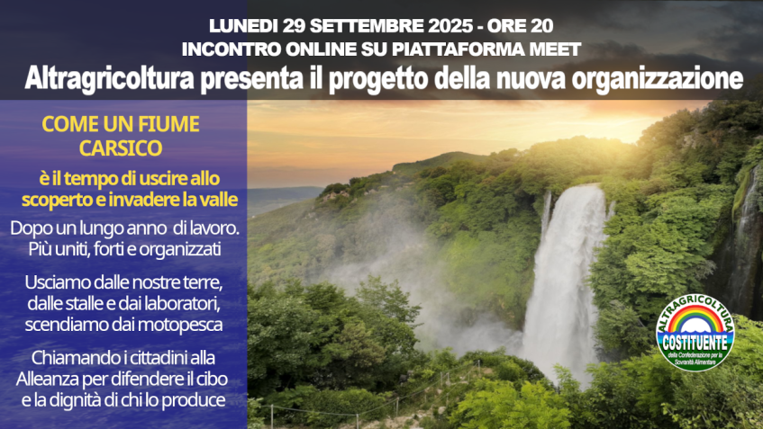 L’incontro si tiene su piattaforma meet Lunedi 29 settembre 2025 alle ore 20. Per partecipare e ottenere il link occorre inviare una mail a organizzazione@altragricoltura.net, o lasciare un commento sotto questo articolo oppure chiedere sulle pagine facebook di Altragricoltura o su Whatsapp.