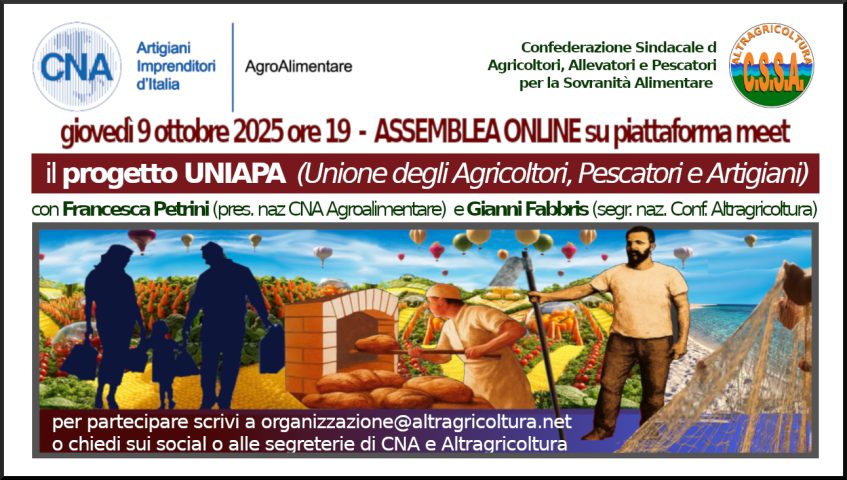 Cosa ci fanno gli Agricoltori, i pescatori, gli allevatori con gli artigiani del cibo? Lo raccontano venerdì sera 9 ottobre alle ore 19 in una assemblea online di presentazione dell’accordo CNA agroalimentare e Altragricoltura CSSA i due responsabili del progetto: Francesca Petrini (presidente nazionale della CNA Agroalimentare) e Gianni Fabbris (segretario nazionale della Confederazione Altragricoltura per la Sovranità Alimentare).
