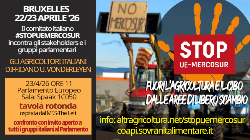 La campagna italiana #STOPUEMERCOSUR arriva a Bruxelles presentata nel primo atto pubblico del Comitato Italiano in una iniziativa organizzata dal Comitato Italiano costituito per opporsi alla decisione della Commissione Europea di attuare comunque l’accordo dal primo maggio 2026 nonostante che il Parlamento Europeo abbia votato a maggioranza di inviare tutti gli atti per la valutazione sul merito e sulle procedure alla Corte di Giustizia Europea