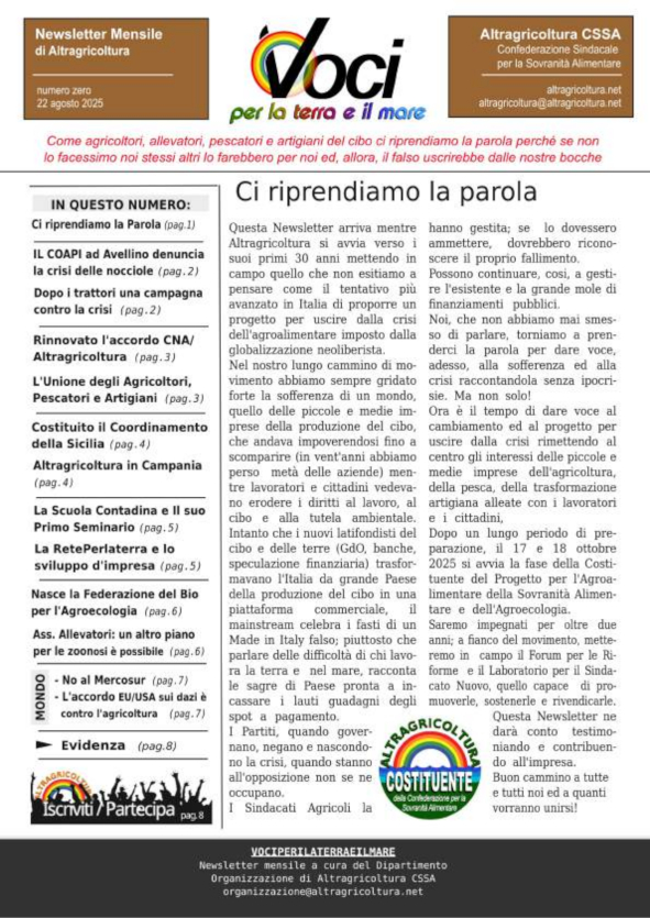 Benvenut@ nello spazio del Foglio Mensile Informativo di Altragricoltura Confederazione per la Sovranità Alimentare. Gestita dal Dipartimento Organizzazione, da conto periodicamente dello sviluppo delle attività della Costituente per la Sovranità Alimentare, il percorso per mettere in campo il progetto nuovo per la Riforma dell’Agroalimentare italiano e per la Nuova Organizzazione di rappresentanza che lo sostenga e lo rappresenti.